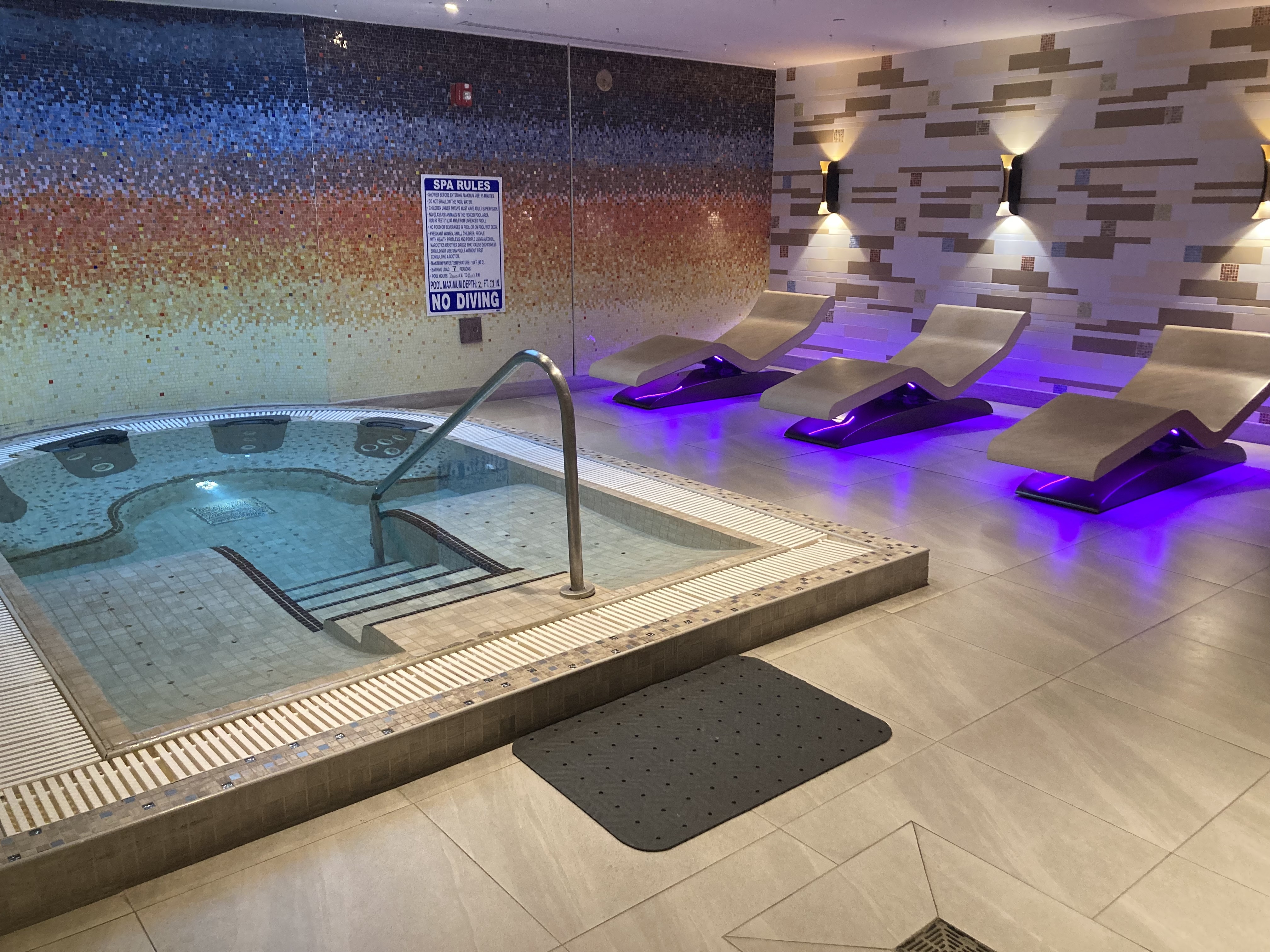 Next come the experience showers. I select the Caribbean Storm, where flashing red lights, rolling thunder, and jungle sounds accompany alternating bursts of warm and cold water. The water rushing all over my body feels immersive and refreshing—a jolt in the best way. After drying off and rehydrating, I make my way into the igloo room for cold therapy. I last only a couple minutes—my tolerance for cold therapy is laughable—before retreating straight to the vitality tub. Warm jets soothe tired muscles as I sink in.