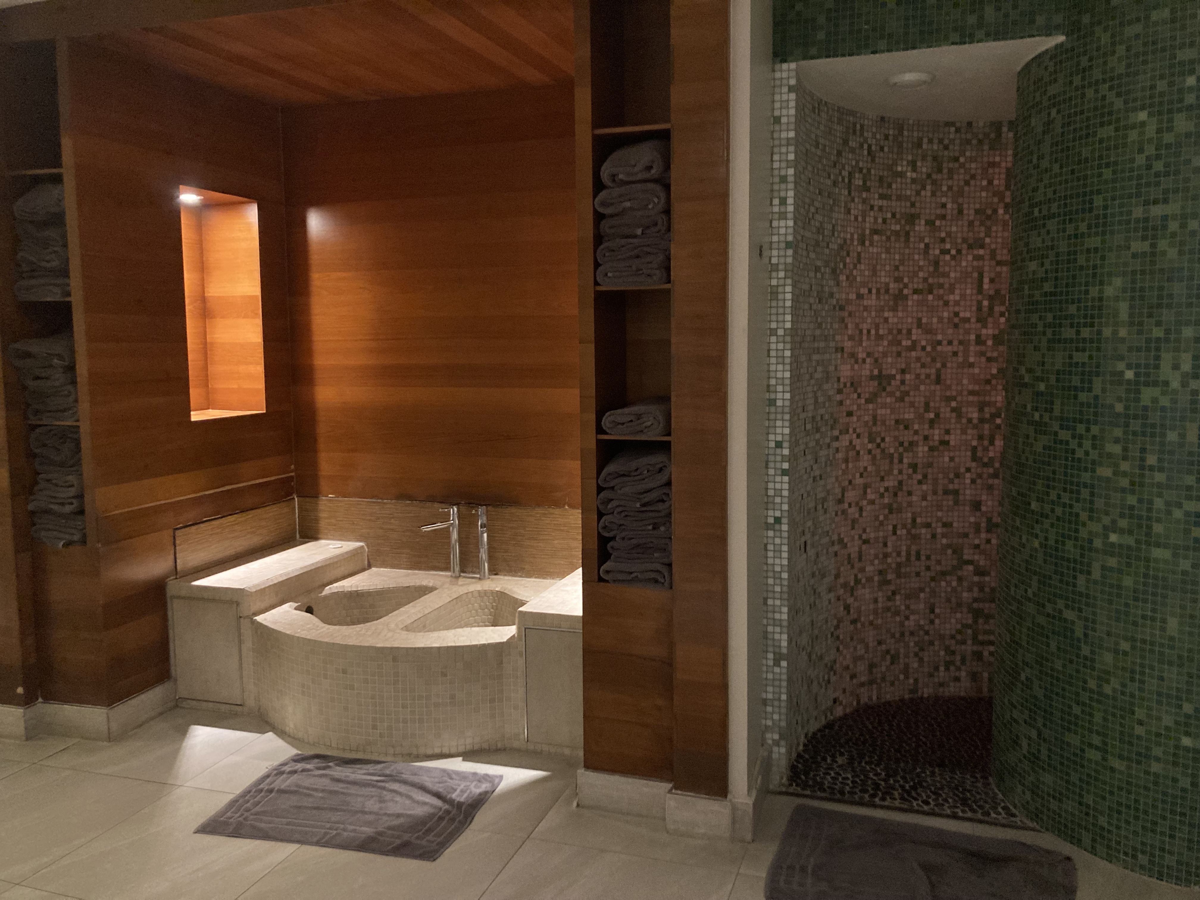 I begin with a cooling shower to rinse off the massage oils before starting my first circuit. As soon as I open the glass door to the sauna, the heat wraps around me. I flip the sand timer and choose a lower bench—a necessity for someone who overheats easily. I close my eyes, breathe deeply, and let the warmth settle in. Sweat begins to trickle down, and I feel my jaw unclench. Fifteen minutes later, I step out, skin flushed and damp.